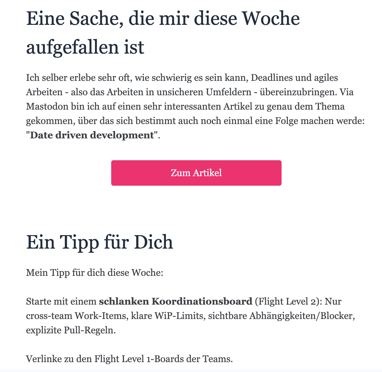 "Flightlevel sind […] sehr interessant, weil sie die Lücke zwischen Teamwork, bereichsübergreifender Koordination und Strategie schließen. So kann man weniger Parallelarbeit haben, […] Blocker über Teams weg […] sicherer machen und das hilft euch bei eurem Gesamtflow."