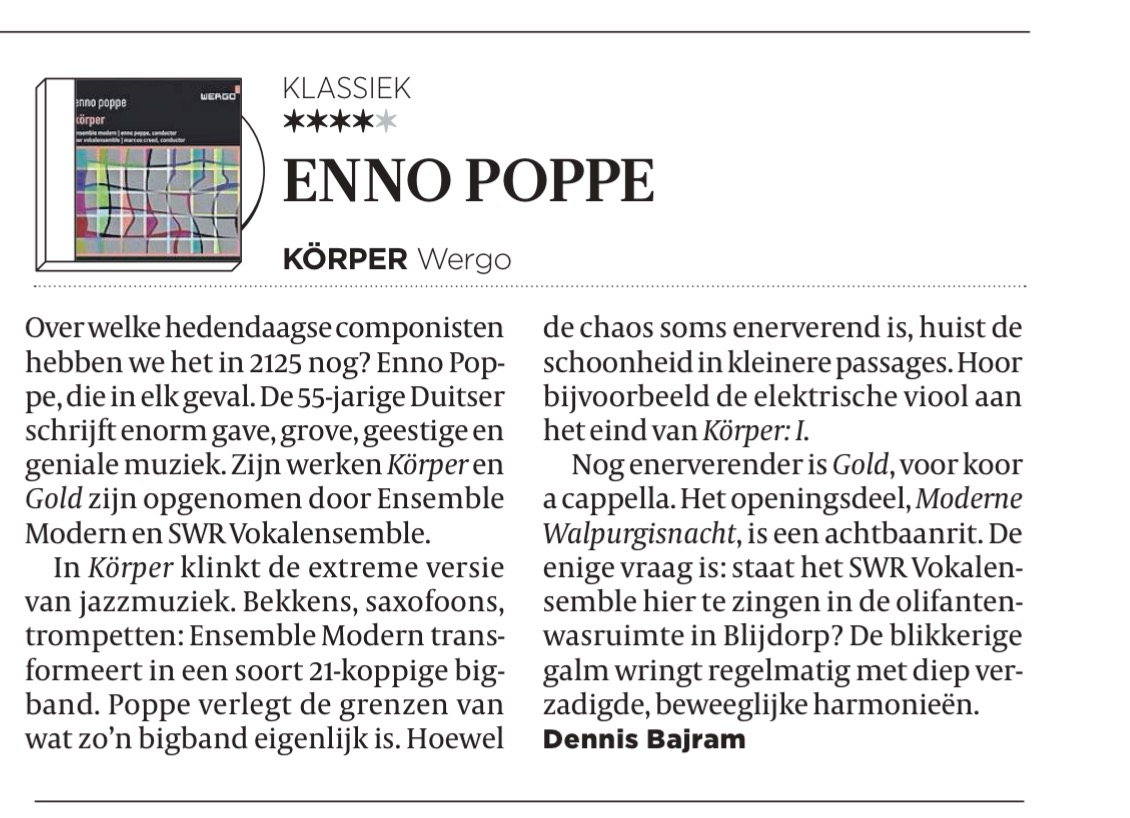 Very interesting new recording by Enno Poppe: Körper. The review mentions “extreme versions of jazz music”. Of course I ordered the CD immediately!