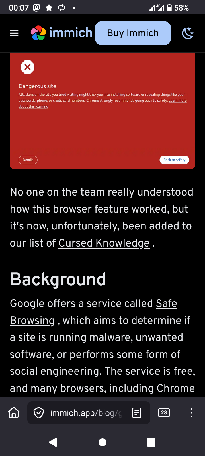 It seems to be quite convenient that google flags immich.app site as dangerous, since immich is an environment in which you can host your own photographs in a safe manner without Google.