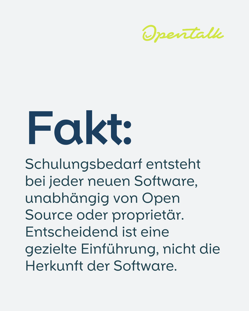 Der Mythos, Open Source sei aufwendig, hält sich hartnäckig. Tatsächlich entsteht Schulungsbedarf bei jeder neuen Software, egal ob offen oder proprietär. Was wirklich zählt, ist eine gezielte Einführung und Begleitung der Nutzer*innen. Mit guter Unterstützung ist Open Source ebenso schnell und einfach einsetzbar wie jede andere Lösung.