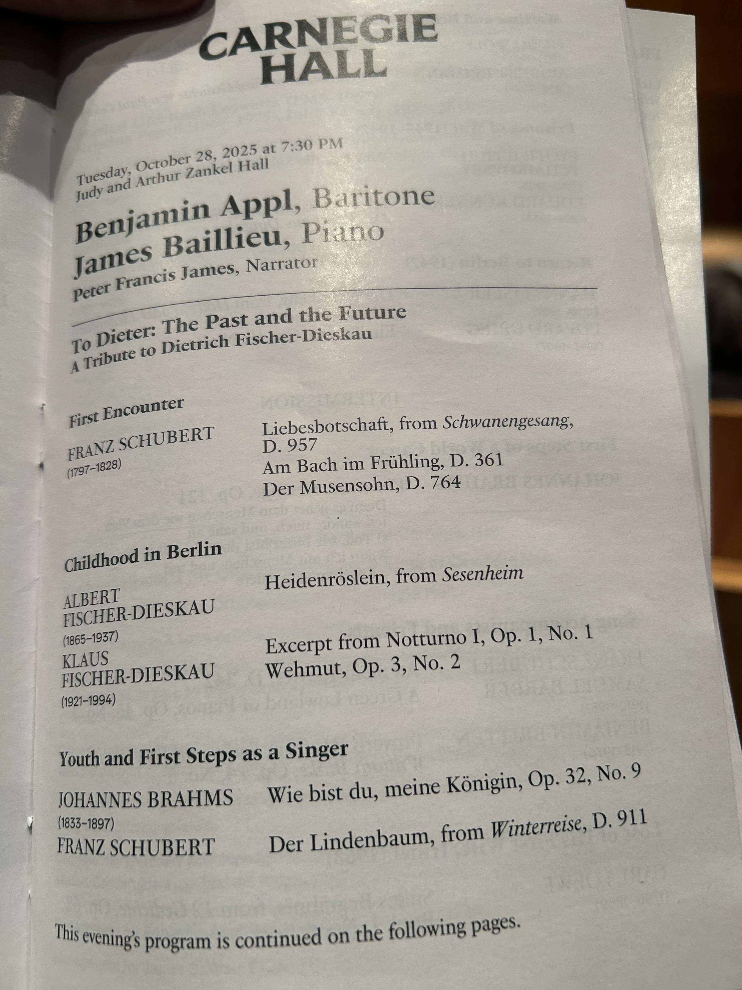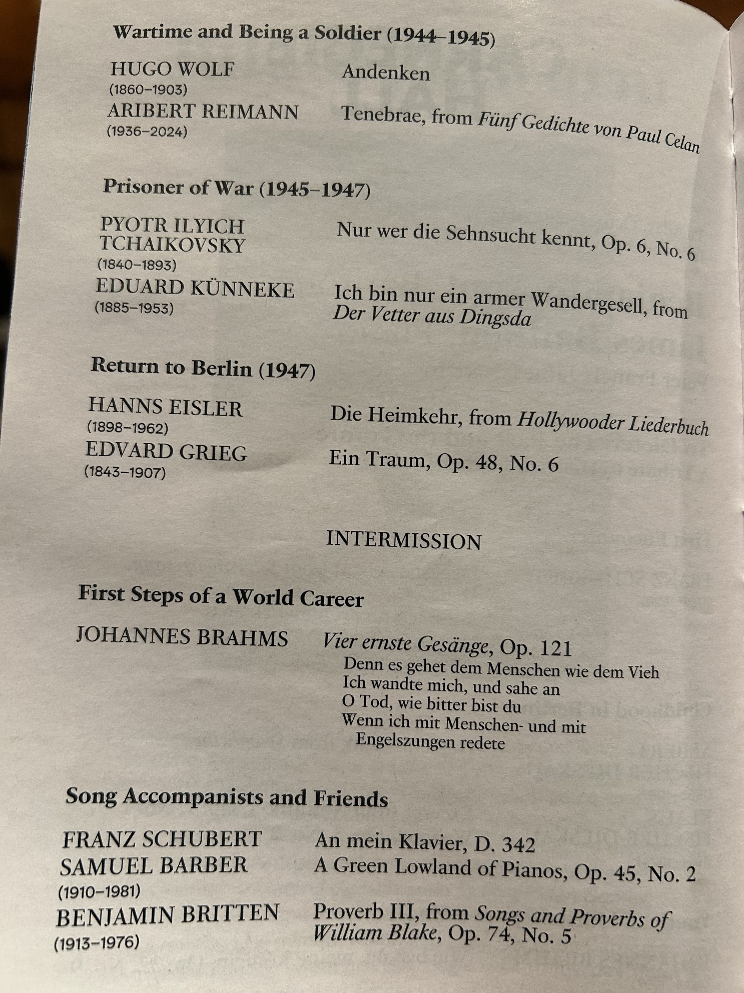 Tonight’s recital was a tribute to his mentor, legendary Dietrich Fischer Dieskau.