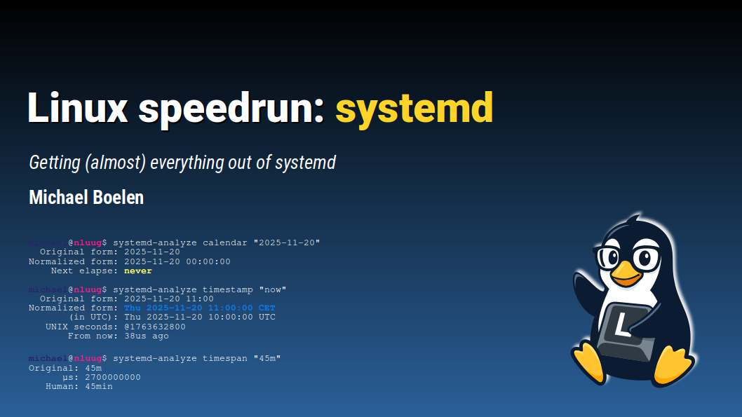 Those attending the presentation can expect a lot of #systemd commands, silly facts, and goodies.