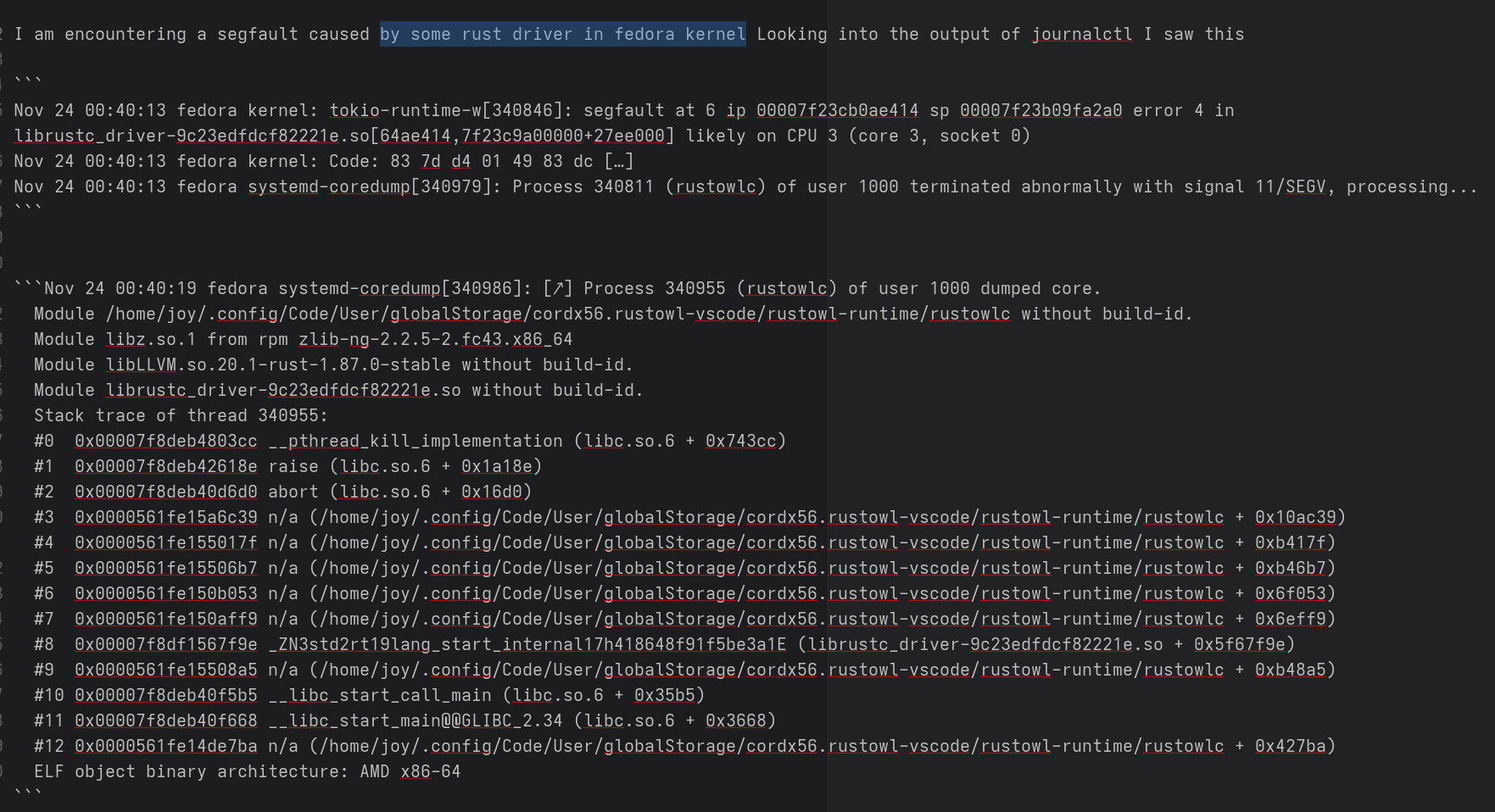 See the slightly edited screenshot from a chatroom message below for an example from today. If you look closer, you see that it is a segfault in a userspace #rustlang program.