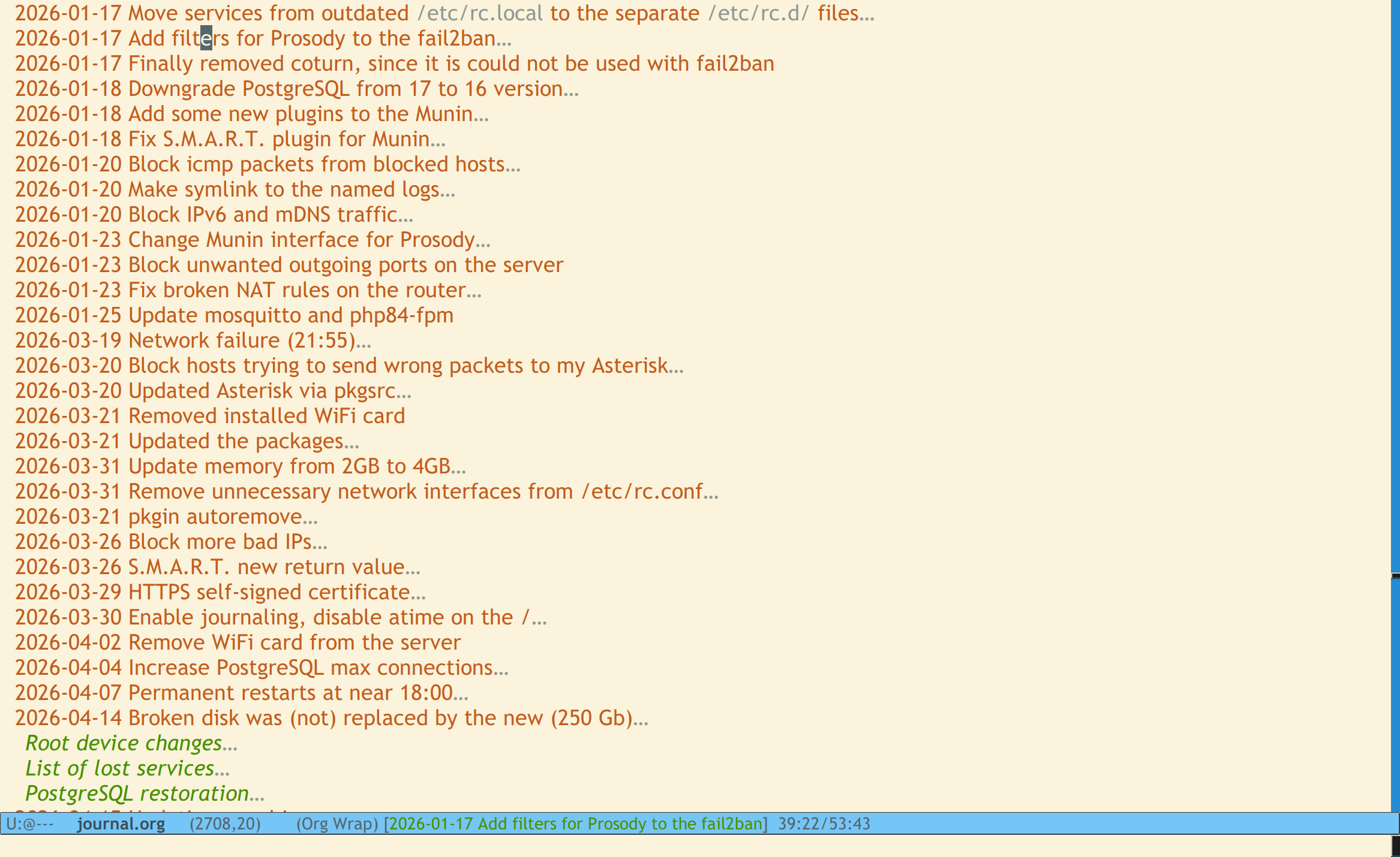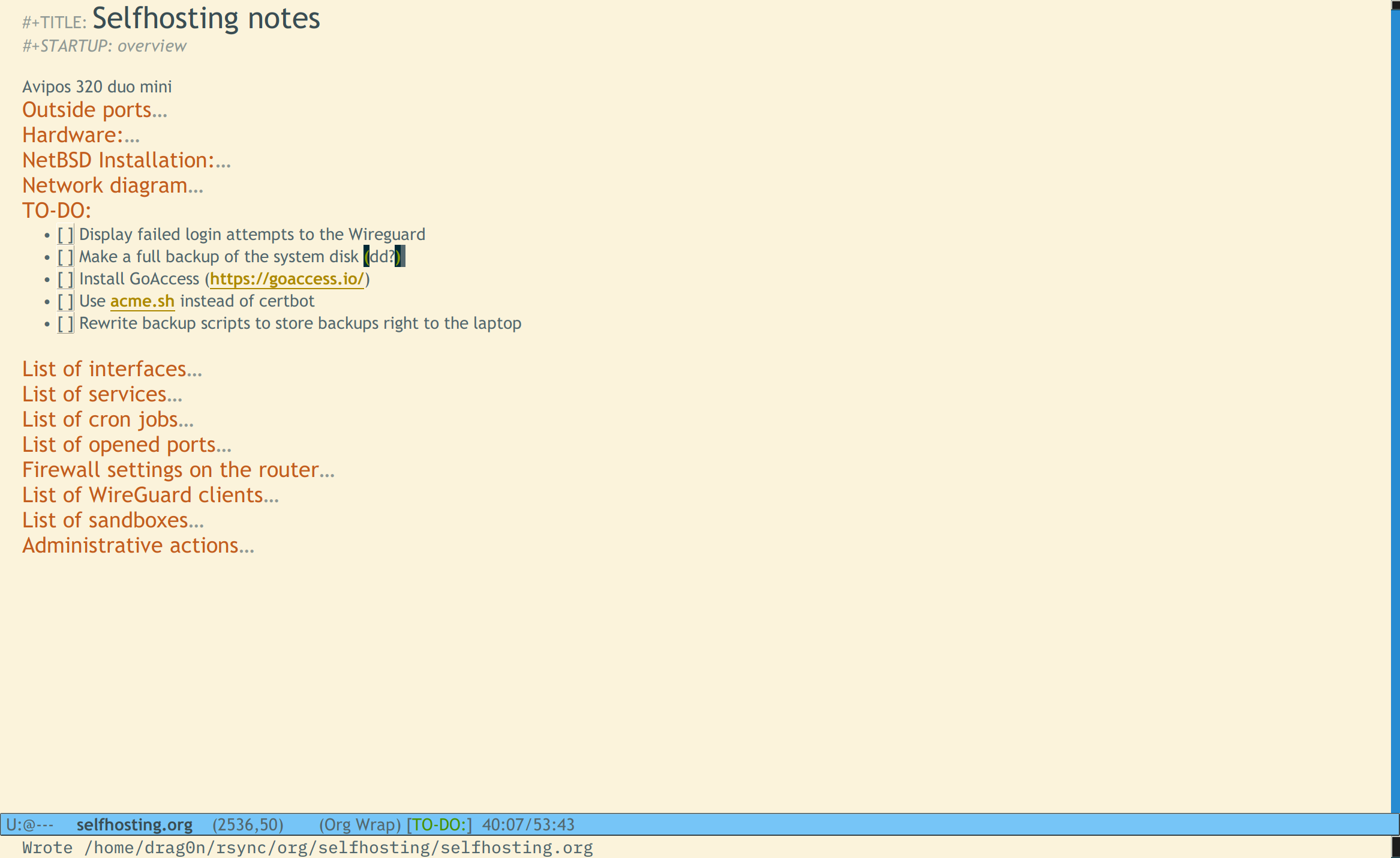 boostedLooks like not only backups but also my obsession^Wpassion to write detailed entries to my "selfhosting journal" pays back. Any change, I made in my main home server, has a date and a detailed description of changes made. Also, the process of #NetBSD installation and service installation is documented too, alongside with documented list of running services, opened ports, cronjobs, etc.